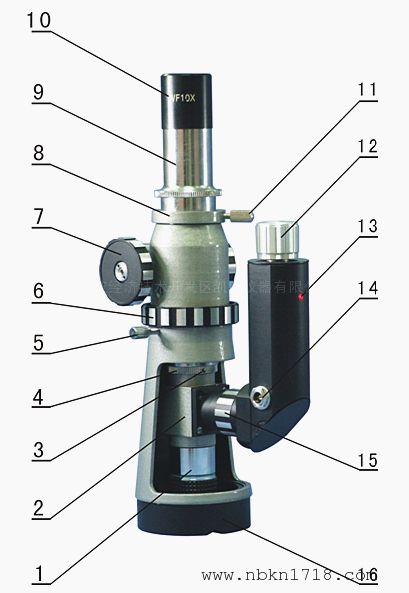 5.微调定位螺钉 6.微调手轮 7.粗调手轮 8.定位套 9.目镜管