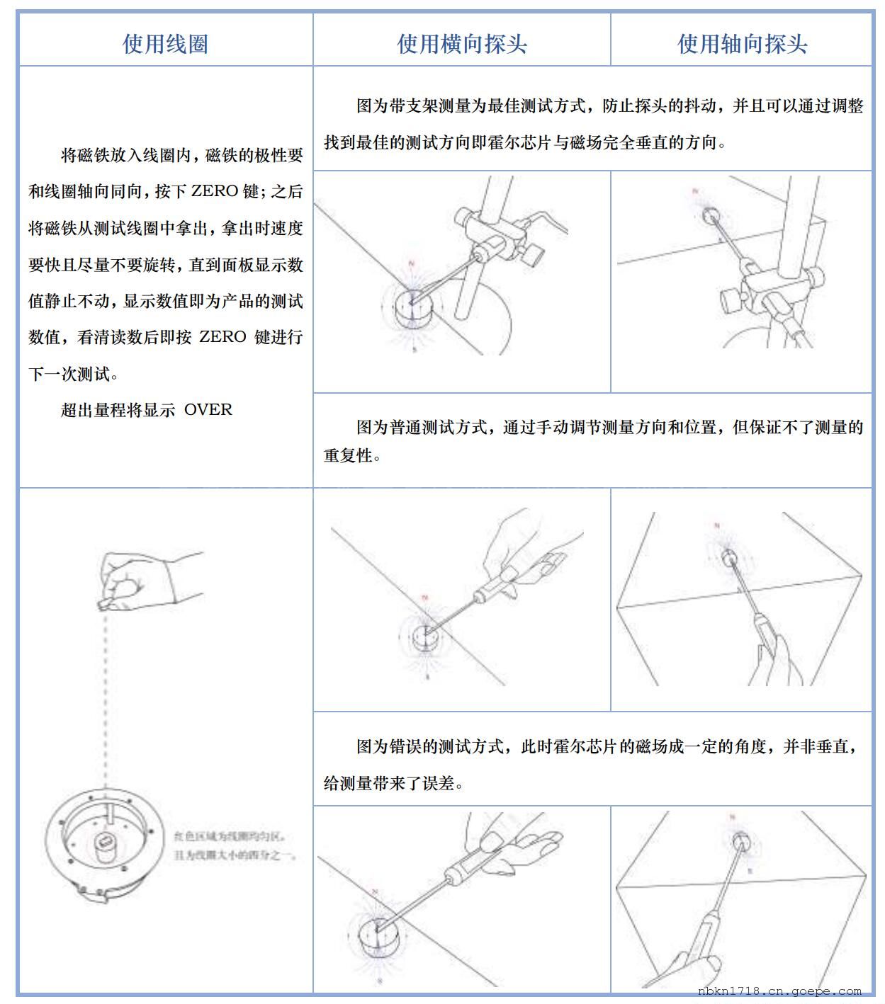 3)将清零后的高斯计探头褪出保护套放回被测磁场区域进行读值,请不要将保护套摘下,测量完毕后可将探头缩回保护套内。请注意所使用的探头类型,不同的探头类型其测试方式与测试位置及方向都不尽相同。