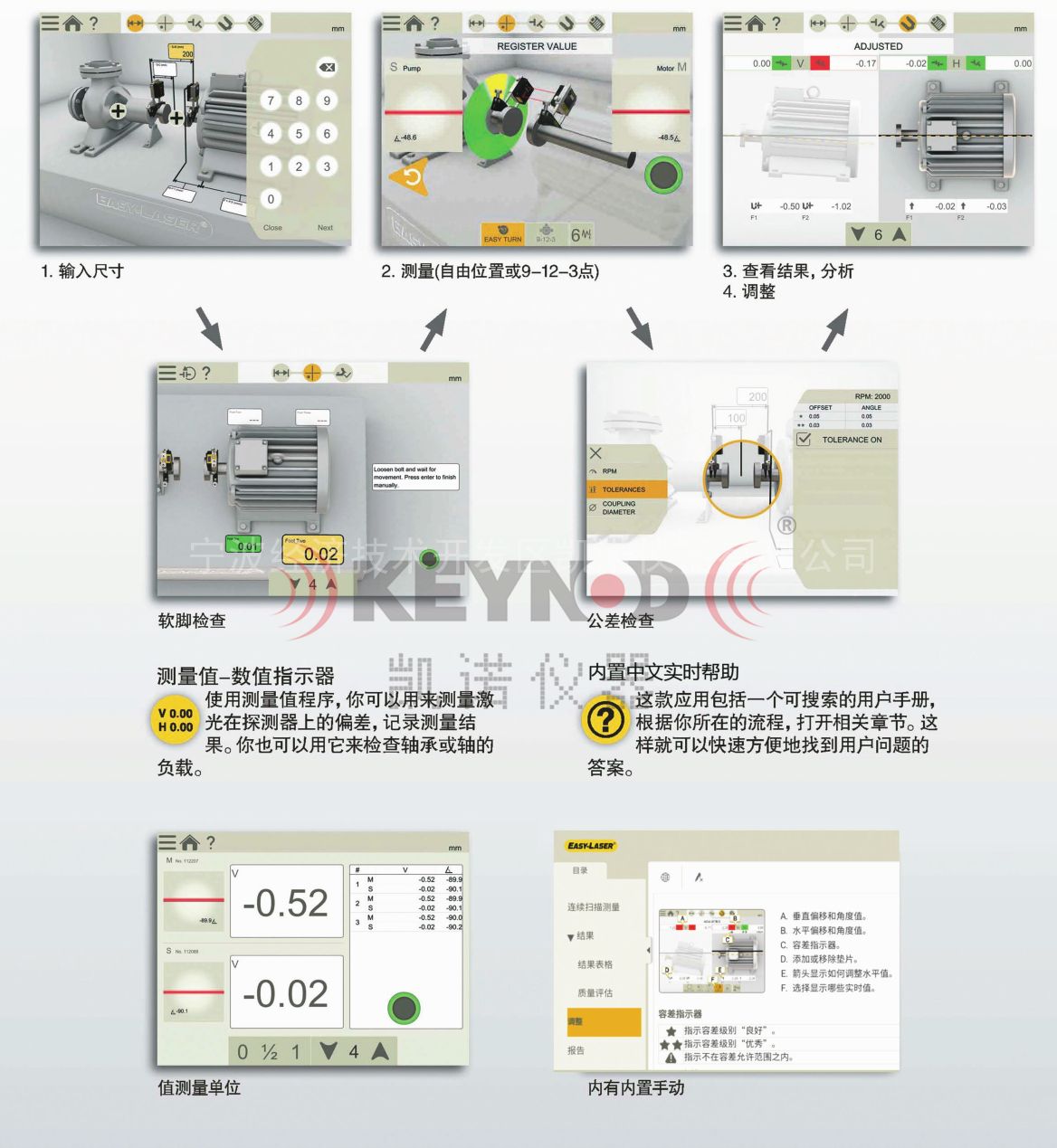 精密对中,热补偿功能、激光探头内置倾角计、连续扫描测量功能、3D 显示的交互界面、非耦合测量功能等等。