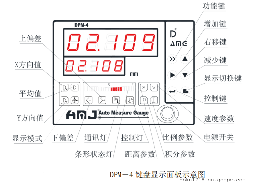按【功能】键,当DY常亮时,表示进入 Y 方向给定值设定状态,其余步骤同“设置平均值给定值”。④设置上偏差值