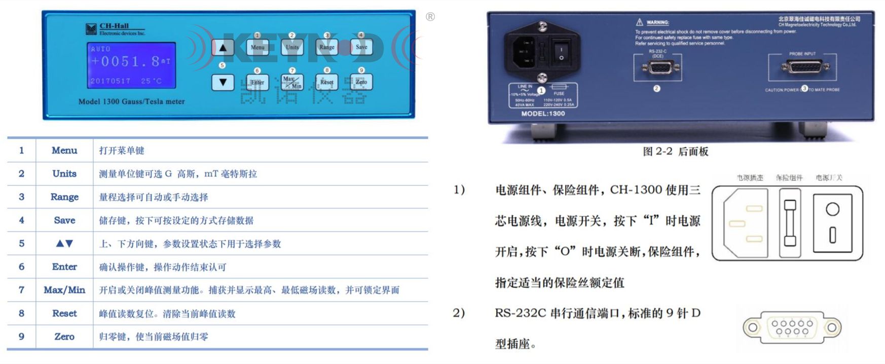 CH-1300后面板包括电源输入组件、保险组件,RS-232C 连接器,探头输入连接器。CH-1300翠海台式数字高斯计产品特性: