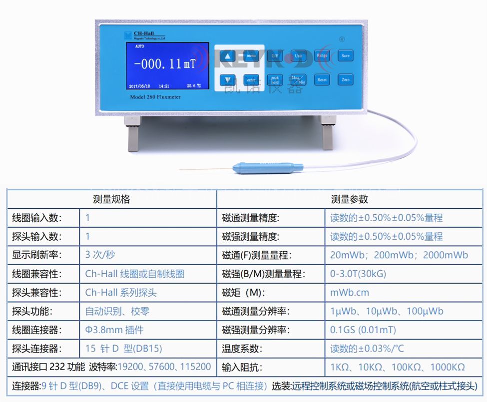 翠海CH-260数字磁通计是一款智能型高精度磁通量和磁感应强度测量设备,由微处理器控制,利用电子积分原理、自动数字抑制调节漂移系统,彩色显示屏显示被测磁通量大小和磁场强度,它可以测量总体磁通量,从而得到磁通密度与磁场强度的值。CH-260磁通计在充磁机中、手动和自动磁体检测和分类中、磁滞回线测量系统都是十分有价值的部件,显示清晰,操作方便,是磁通及磁强测量的理想工具,可接霍尔探头更精确测试磁场强度,是全数字化多用机。提供数字 RS-232、USB与继电器信号输出。配有各类亥姆霍兹线圈及单线圈。