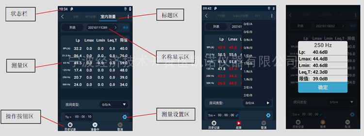 当进入室内噪声测量功能后,测量区显示室内测量值,纵向是SPL(A)、31.5 Hz、63 Hz、125 Hz、250 Hz、500 Hz。横向是测量指标:Lp、Lmax、Lmin、Leq,T。“限值”下面显示的是A 计权、31.5 Hz、63 Hz、125 Hz、250 Hz、500 Hz 标准限值,当测量结果超过标准限值时,颜色从白色变成红色,表示超标。点击房间类型后方的控件可切换房间,房间类型限值按GB 12348—2008 及GB 22337—2008 标准的要求设置。爱华声级计AWA6292主要亮点: