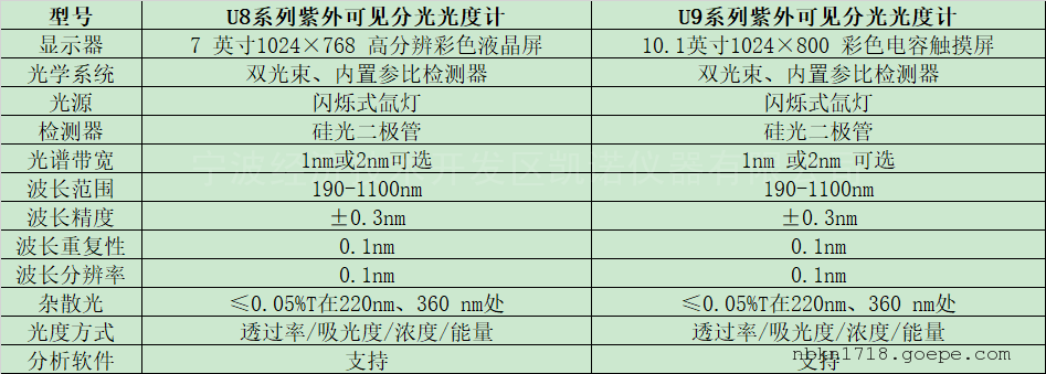 T-U8型佑科氙灯双光束紫外可见分光光度计对应触摸屏款型号参数对比:
