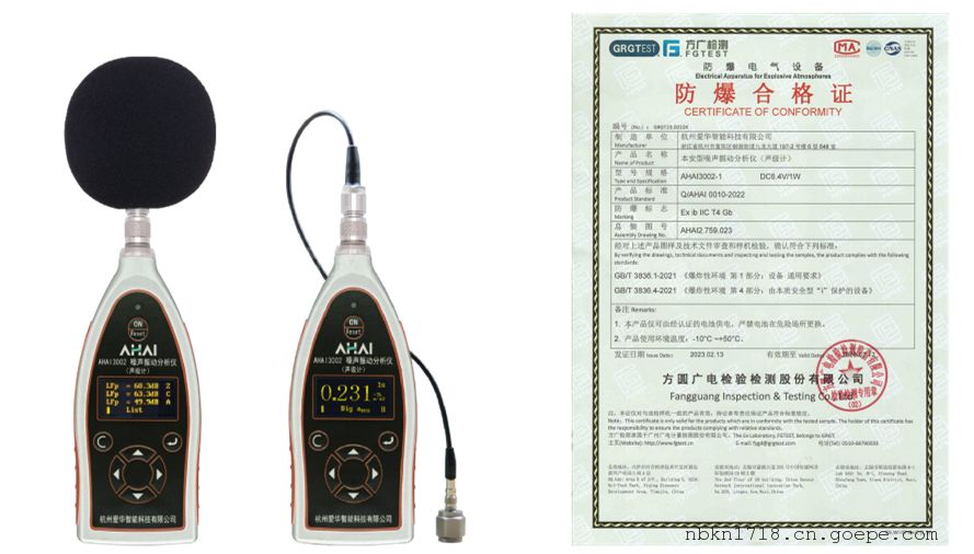 杭州爱华智能本安型AHAI3002-1噪声振动分析仪(声级计)采用数字信号处理技术,模块化设计,具有测量范围大、耗电省、体积小等优点,长期运行可靠稳定。 产品具有噪声和振动测量功能,声学部分符合GB/T 3785.1-2010和IEC 61672-1:2013标准对1级声级计的相关要求,并取得型式批准证书。振动部分符合JJG 676-2019《测振仪检定规程》的相关要求。 一机多用,集声级计、积分声级计、噪声统计分析仪、频谱分析仪、测振仪、手传振动测量仪于一体,噪声、振动智能切换。本产品的防爆结构是经过国 家指定检验单位审查,检验合格,并签发相应防爆合格证的工厂用防爆电器设备,防爆标志为Ex ib IIC T4 Gb,与目前市场上主流产品相比该款仪器测量范围更宽、设备级别更高,且一机多用。