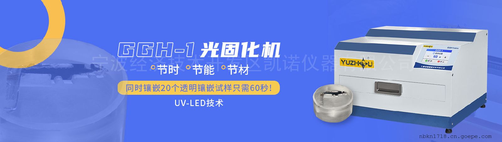 GGH-1型新款金相镶嵌光固化机产品特点:(1)制样速度快,透明镶嵌完成时间只需60秒