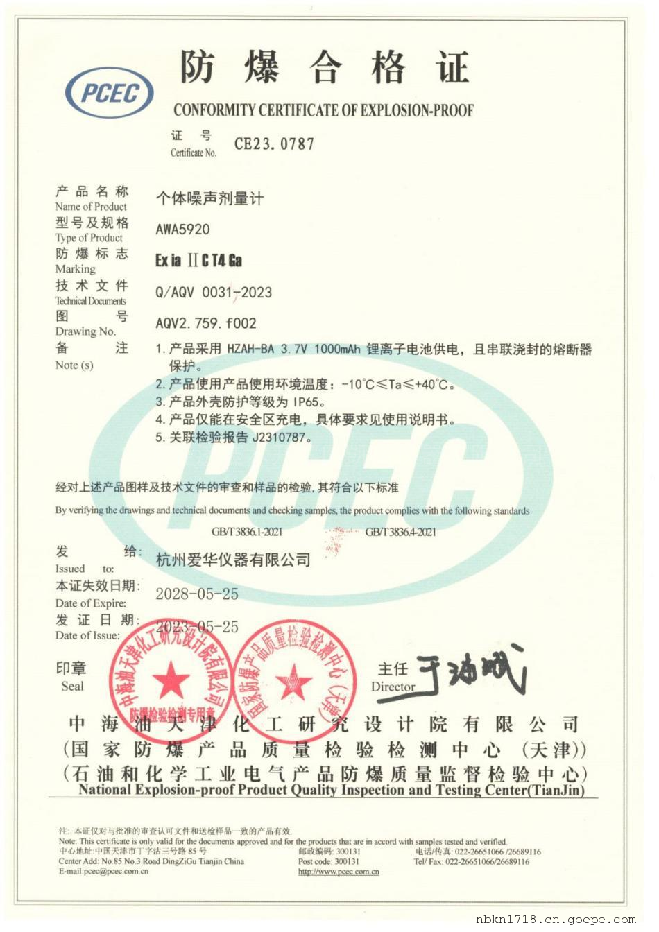宁波凯诺仪器总代理销售爱华AWA5920新款个体噪声剂量计,该款仪器已取得本安型防爆证书(Exia IIC T4 Ga),仪器背面可见防爆标志;性能符合GB/T 15952—2010/IEC 61252:2017的要求,符合GB/T 3785.1—2010/IEC 61672-1:2013标准对2级声级计的要求,同时符合GB/T 3241—2010/IEC 61260-1:2014标准对2级滤波器的要求。AWA5920型个体噪声剂量计可以广泛用于各种机器、车辆、船舶、电器等工业噪声测量和环境噪声测量,尤其是可以用于测量脉冲噪声。适用于工厂企业、环境保护、劳动卫生、教学、科研等领域。
